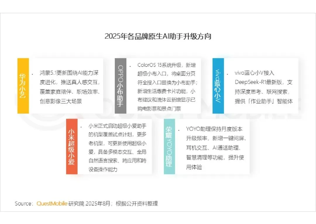 AI 技术进入原生化阶段,深度融入手机原生服务生态,从附加功能变为核心能力。各品牌原生 AI 助手全面升级:华为小艺强化真人感交互,OPPO 小布优化全场景服务,vivo 蓝心小 V 接入大模型支持深度思考,小米超级小爱实现跨设备操作,荣耀 YOYO 提升便捷体验。