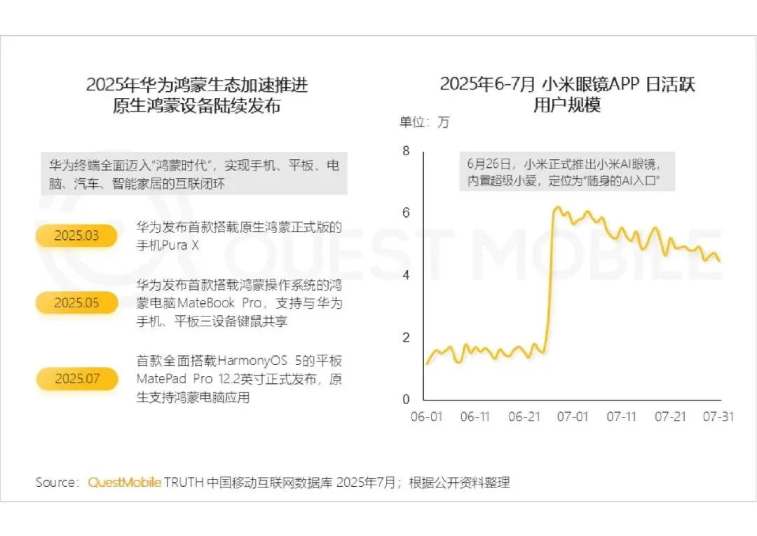 生态协同成为战略重点,华为鸿蒙生态实现手机、平板、电脑、汽车、家居闭环,小米以 AI 眼镜为新入口,手机成为全场景智能中枢,跨设备互联成为品牌核心壁垒。