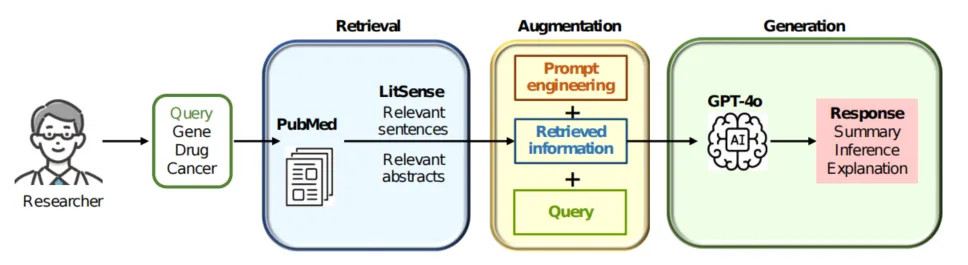传统模型:靠训练时的记忆回答(类似闭卷考试,知识会过时)。 RAG 架构:在回答前,先去权威数据库(如 PubMed, OncoKB, CIVIC)里检索最新的证据,再结合这些证据生成回答(类似开卷考试,有据可查)。