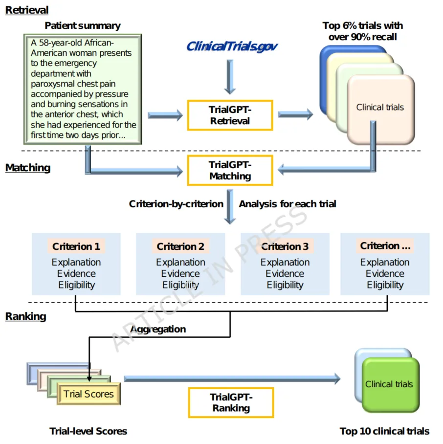 [TrialGPT 运行机制图]解读:重点展示其如何逐项(Criterion-by-criterion)分析患者病历与试验要求的逻辑关联。