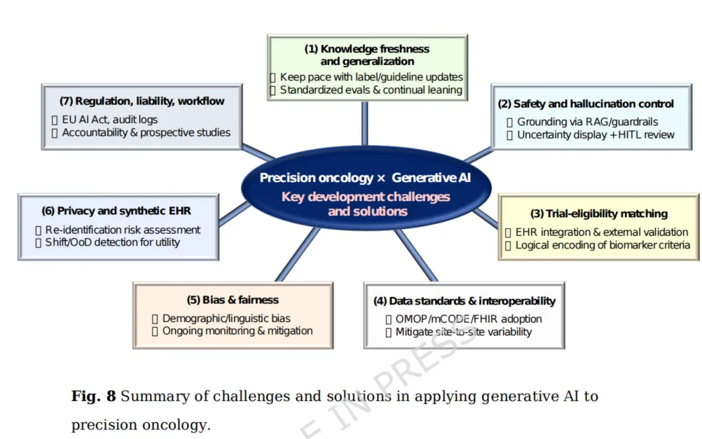 如果说前沿模型是“引擎”,那么这篇综述总结的挑战与解决方案全景图 就是确保这台赛车不脱轨的“导航仪” 。作者系统性地梳理了 GenAI 在精准肿瘤学落地的 7 大轴心挑战,并给出了针锋相对的破局方案 。