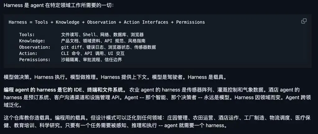 它通过 12 个递进式课程,教你如何从零开始为 AI 智能体构建运行环境。其核心理念是:智能体的“智能”源于大模型本身,而非特定的框架或提示链。开发者的核心任务是构建模型运行所需的“外部世界”,包括工具、知识、上下文和权限管理。