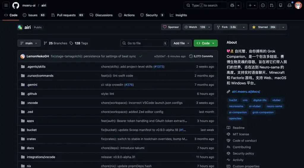 Project AIRI 旨在复刻类似 Neuro-sama 那样能互动、能玩游戏的 AI 虚拟主播,目前 Star 数已接近 3.6 万。
