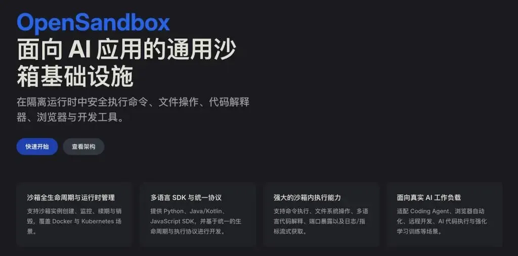 项目亮点:阿里巴巴开源的安全、通用 AI 应用沙箱平台,为 AI Agent 执行代码、操作文件等任务提供隔离的运行环境。