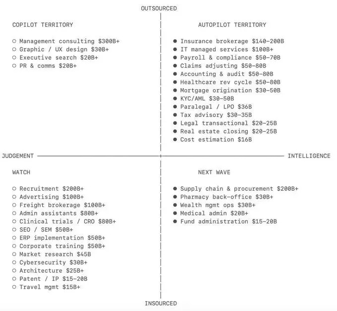 - 高智能、外包领域(Autopilot Territory,自动驾驶区):流程标准化、规则明确的服务已率先进入AI全面接管阶段。例如保险经纪(1400-2000亿美元)、会计与审计(美国外包部分500-800亿美元)、IT管理服务(1000亿美元+)、医疗营收循环管理等。这些领域工作高度重复,AI代理可直接取代人力,提供“成果即服务”(Results as a Service)。报告特别指出,保险经纪的标准化商业险种本质上是“购物比价+表单填写”,碎片化经纪人市场为AI切入提供了绝佳机会。