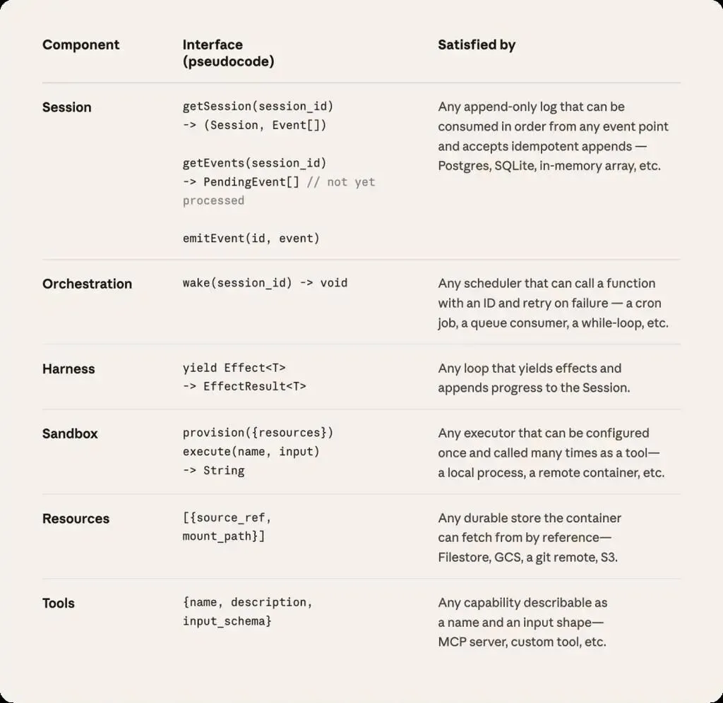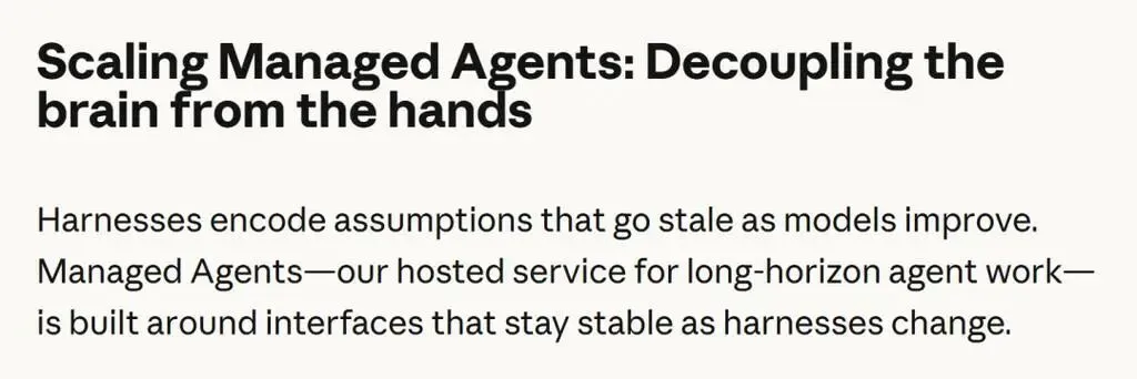 当“养虾”陷入困境时,Anthropic推出的Managed Agents带来了全新的解决方案。其核心在于进行了一场彻底的“架构解耦”,将智能体拆分为三个标准化的组件,这一设计哲学致敬了Unix操作系统的模块化思想: