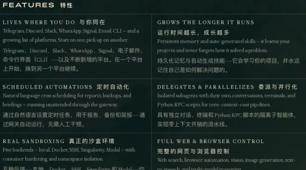 Hermes Agent作为一个可部署在自有服务器上的常驻智能体,具备六大核心特性:持久化运行、持续学习优化、定时任务自动化、任务委派与并行执行、安全的沙盒隔离环境,以及完整的网页与浏览器控制能力。Nous Research的理念是打造一个“伴随用户成长”的智能体,强调Agent应是私有、常驻、能够积累经验并最终反哺模型训练的伙伴。
