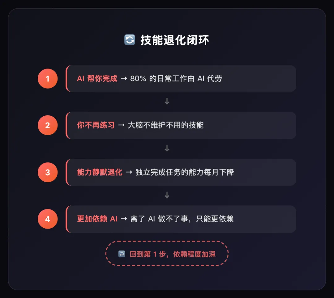 AI 帮你做了 → 你不练了 → 你的能力退化了 → 你更依赖 AI 了 → AI 帮你做得更多了