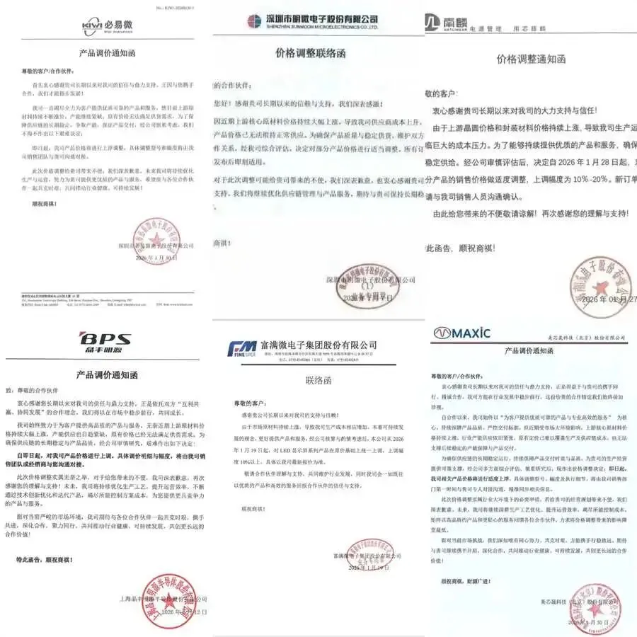 1月19日,富满微电子率先发布调价通知。随后,必易微、美芯晟、南麟电子、明微电子、晶丰明源五家头部企业相继跟进。短短两个月内,国内LED驱动芯片核心阵营完成“全员涨价”,涨幅普遍在10%-20%之间,部分高端产品涨幅突破25%。