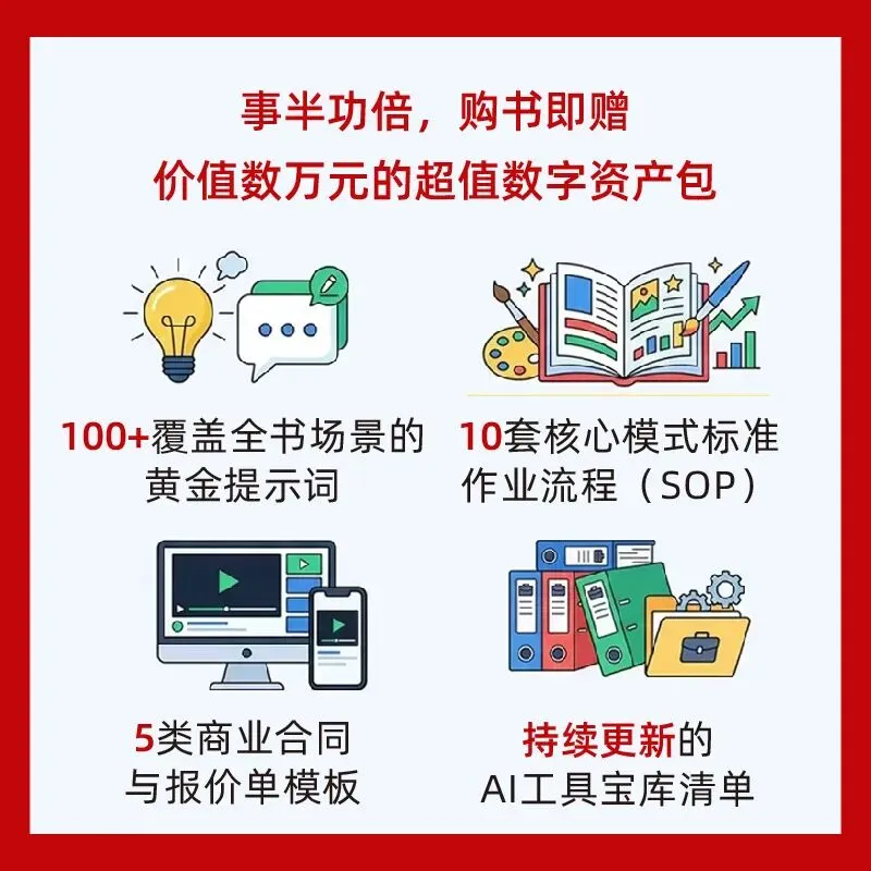 这本书的链接在下面。它不是用来“读”的,是用来“做”的。随书附赠的SOP流程图,打印出来贴墙上;100条提示词,复制到工具里直接用;21天计划表,每天划掉一个任务。