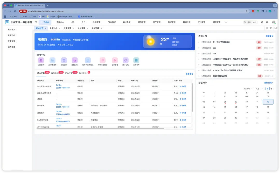 从产品架构来看,它的数据联动做得非常漂亮:比如 HR 员工入职自动开通账号,采购申请无缝流转到 ERP 下单和 EAM 资产登记,底层配合丝滑的 Flowable 7 工作流引擎,直接打通企业全链路。