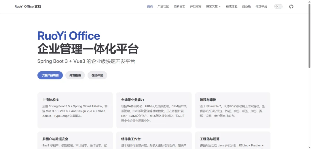 RuoYi Office 官方介绍,它不仅仅是个底层脚手架,更是直接内置了开箱即用的 14 大核心业务模块。