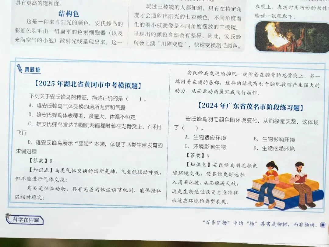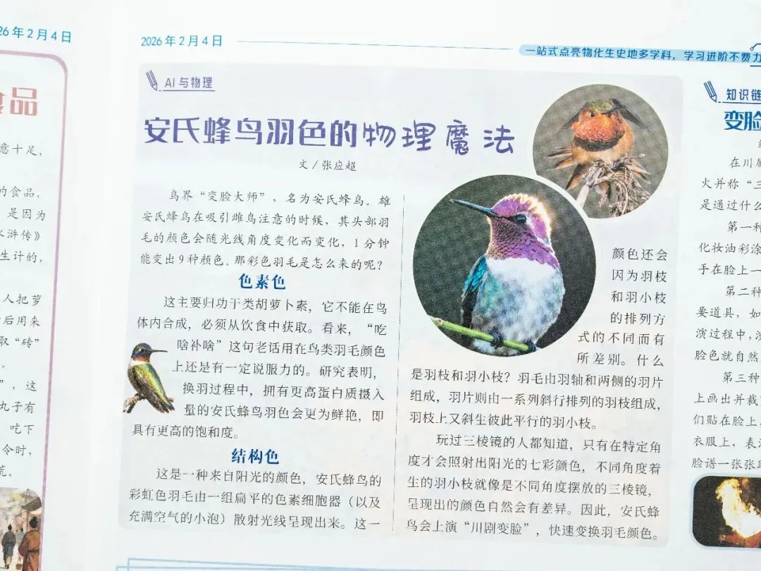 比如这篇《安氏蜂鸟羽色的物理魔法》,给孩子拓展各种知识面。