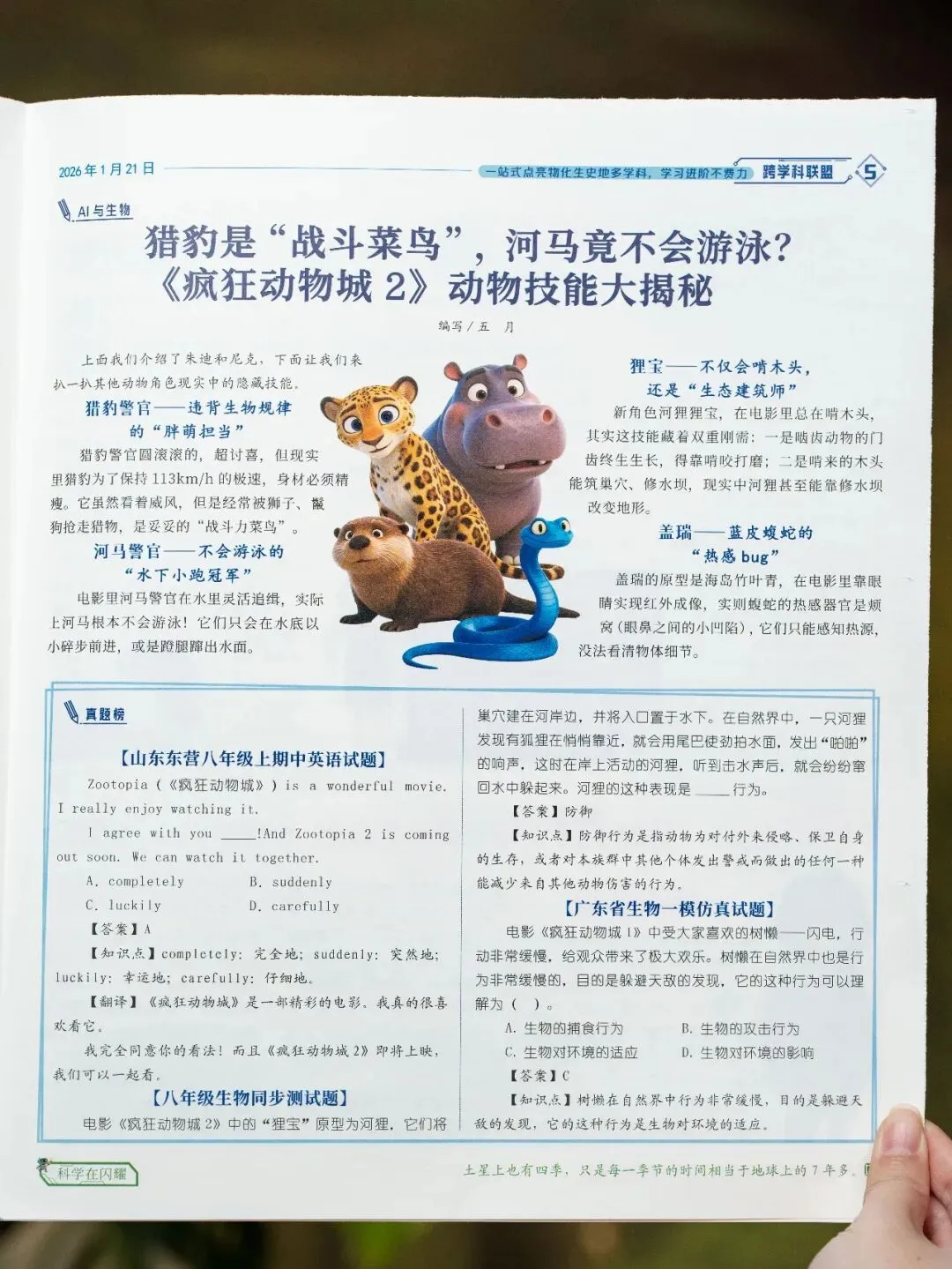 给孩子讲《疯狂动物城》里的生物知识时,还拓展初中生物、英语相关的试题。