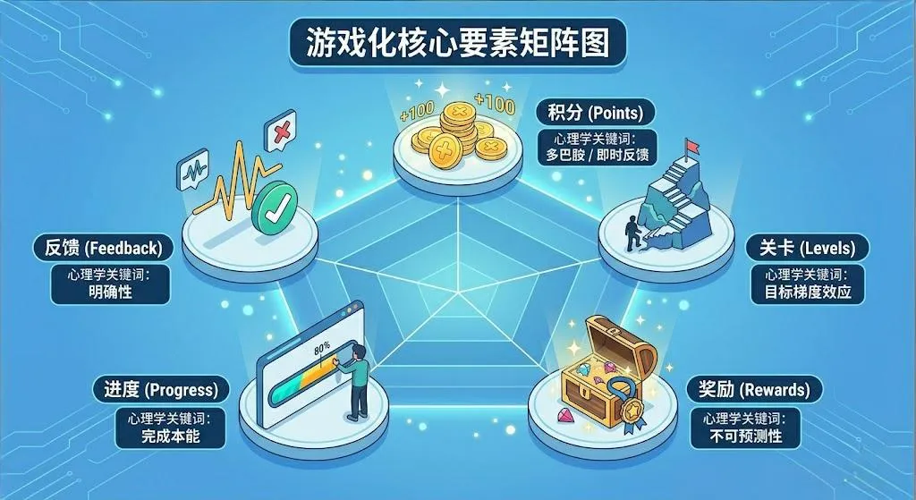 基于马隆等人的研究,游戏化设计逐渐形成了一套核心要素。这些要素不是可有可无的点缀,而是有心理学依据的设计原则。