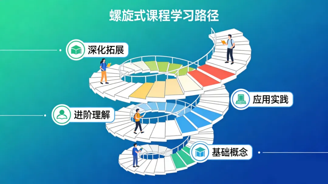 螺旋式课程的设计和实施面临几个挑战:重复与枯燥的平衡(重复是必要的,但过度重复会导致枯燥。需要找到恰当的重复频率和形式)、深度的渐进性(每次深化多少?太慢浪费时间,太快让学习者跟不上)、主题的选择(哪些主题值得螺旋式展开?不是所有内容都需要反复深入)。