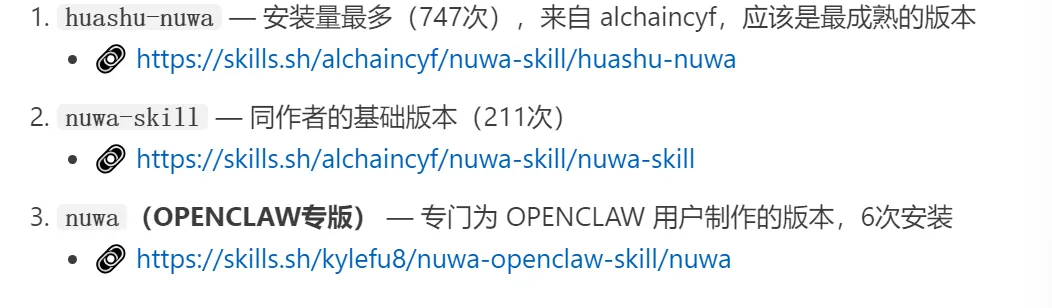 安装女娲的过程很简单——在技能市场中搜索"女娲",共找到三个:
