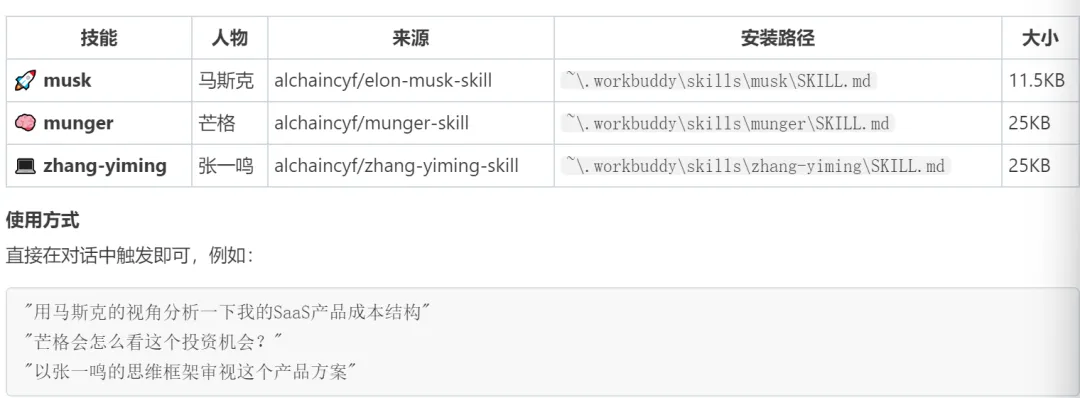 通过这三步,最终产出一个叫 SKILL.md 的文件——一份结构化的"思维操作系统说明书"。AI安装它之后,就能用这个人的认知框架来分析和回答问题了。