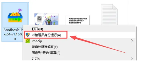 2,打开解压好的文件夹,找到应用程序【Sandboxie-Plus-x64-v1.16.9.exe】,鼠标右键选择【以管理员身份运行】。