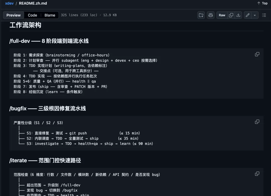 这种“基于上下文决策”的模式,正是资深开发者与初级开发者的核心区别:后者等待指令,前者主动规划。xdev将这种高阶思维过程编码进了工作流。