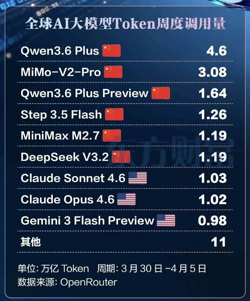 2026年2月26日,全球AI产业的历史记录本上写下了一个新坐标。据OpenRouter数据,中国AI模型周调用量首次超越美国,全球前五模型中中国占据四席,呈现出"集群式崛起"的态势。