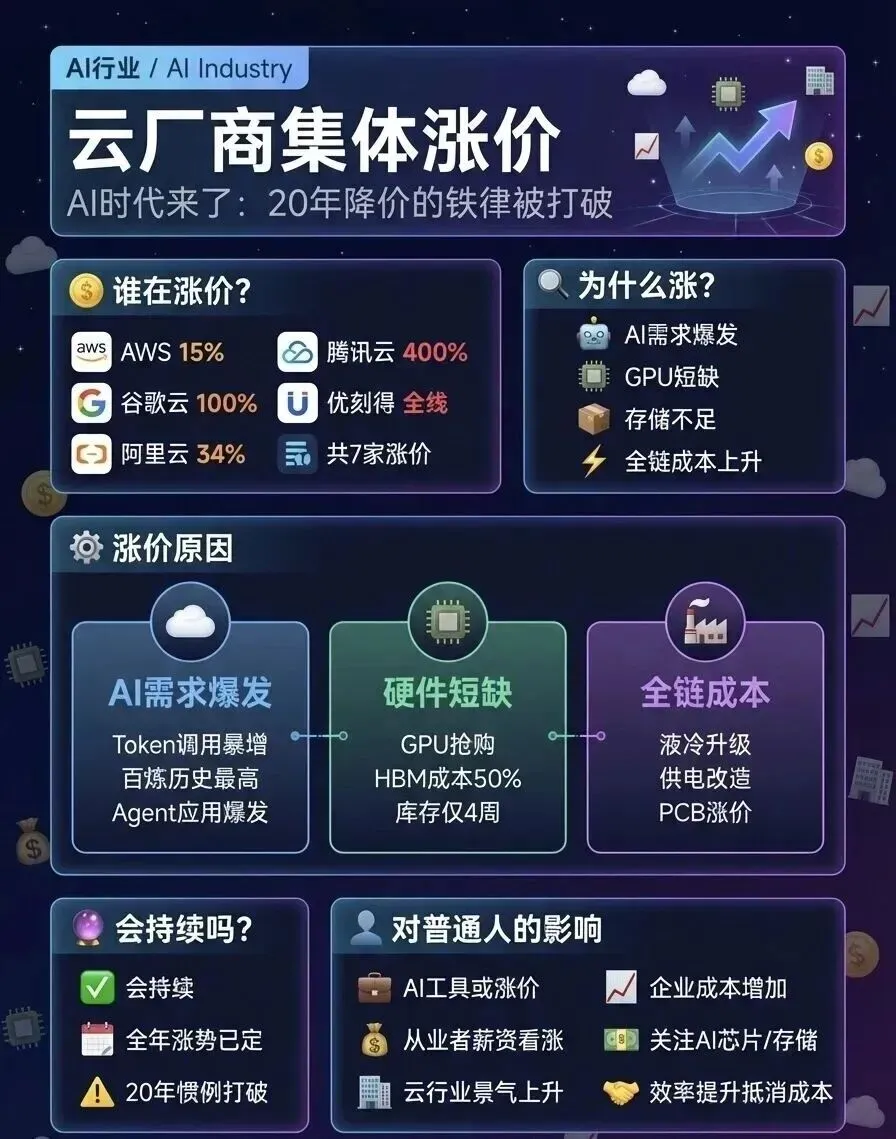 与此同时,持续两年多的AI价格战戛然而止。阿里云、腾讯云、百度智能云、智谱等主流厂商几乎同步调价,最高涨幅达463%。这标志着AI产业正在经历一个从"跑马圈地"到"价值变现"的系统性转折。