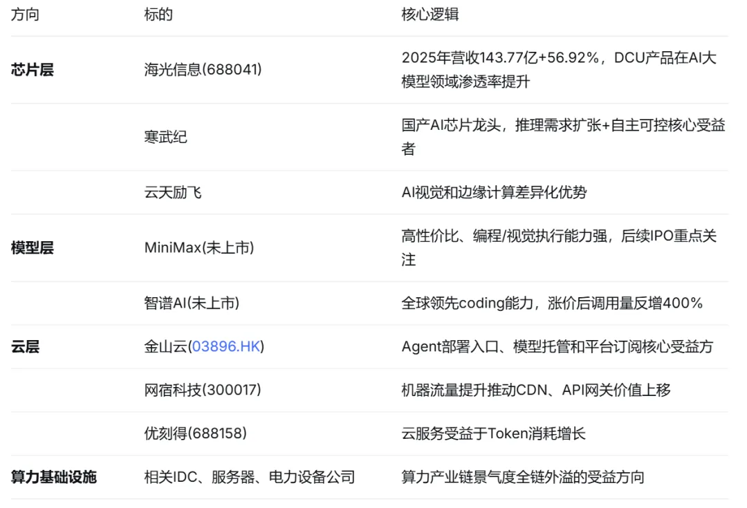 云是本轮高确定性的"卖铲人"。金山云、优刻得等受益于一键部署、模型托管、知识库、Agent平台订阅和企业级治理需求;网宿科技受益于机器流量提升后,CDN、API网关、边缘安全和流量治理价值上移。
