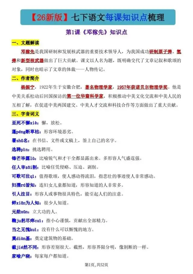 今天给大家分享的是:26春七年级下语文每课知识点梳理,有需要的家长可以给孩子们打印出来练一练,及时查漏补缺。