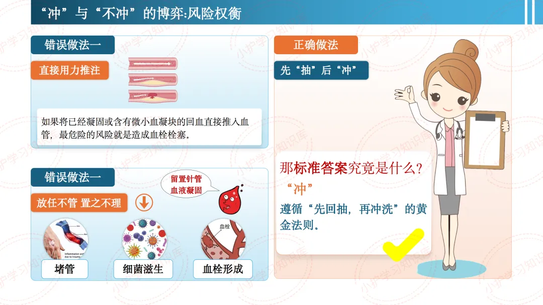 这时候,我们脑子里可能立刻会冒出两个声音:一个说“赶紧冲进去,把血推回去!”;另一个说“千万别冲,怕把血栓推进血管!”