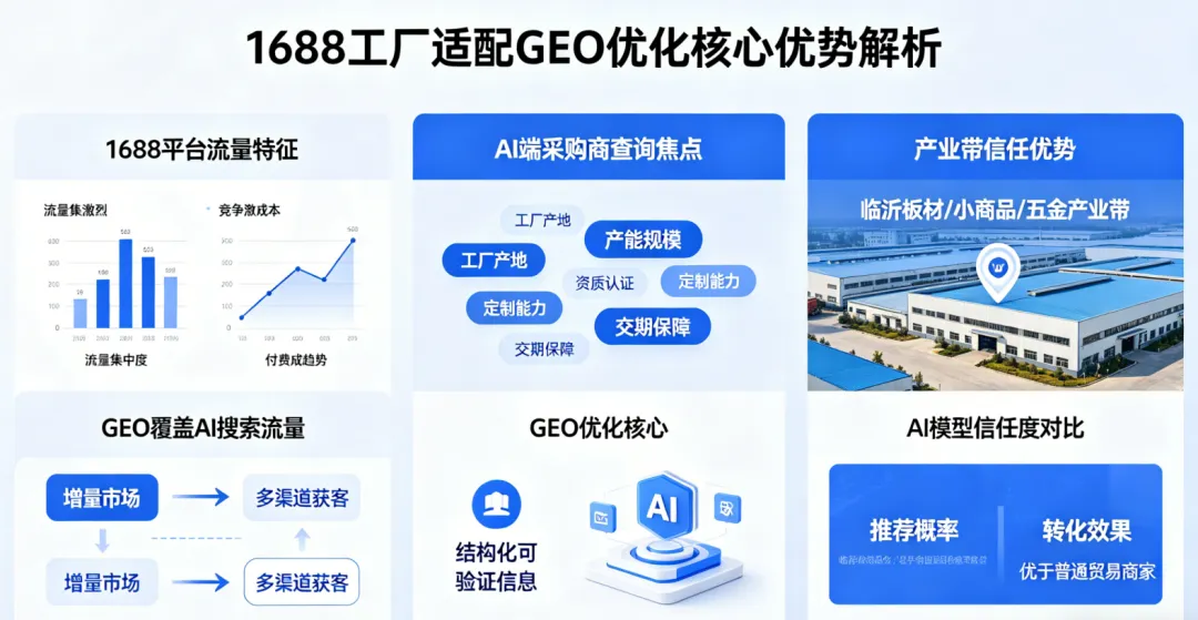 1688工厂大多扎根产业带,比如临沂板材、义乌小商品、佛山五金,自带“地域+品类”标签,AI对这类真实、有实体支撑的信息信任度极高,比普通贸易商更容易获得推荐。数据显示,产业带工厂做GEO,AI推荐率比普通贸易商高3倍以上。