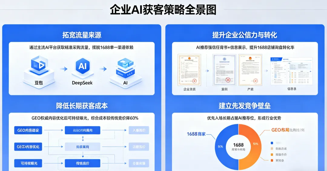 传统1688推广,预算一停流量就断;而GEO一次优化,长期受益,获客成本比平台竞价低60%,不用持续投钱,就能实现免费曝光。