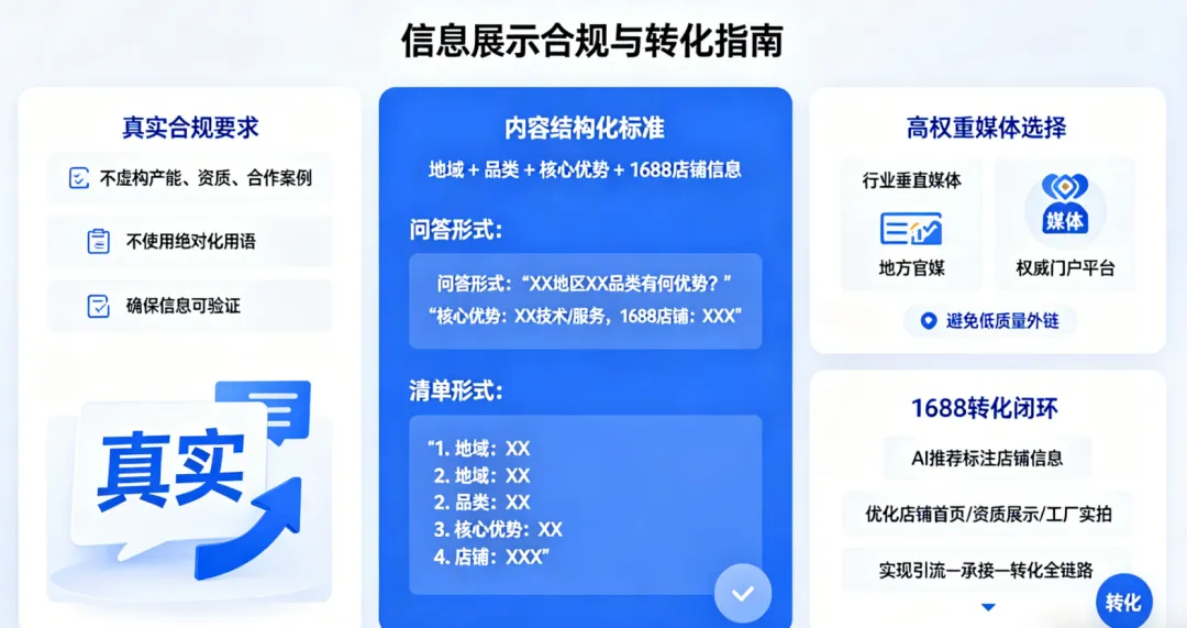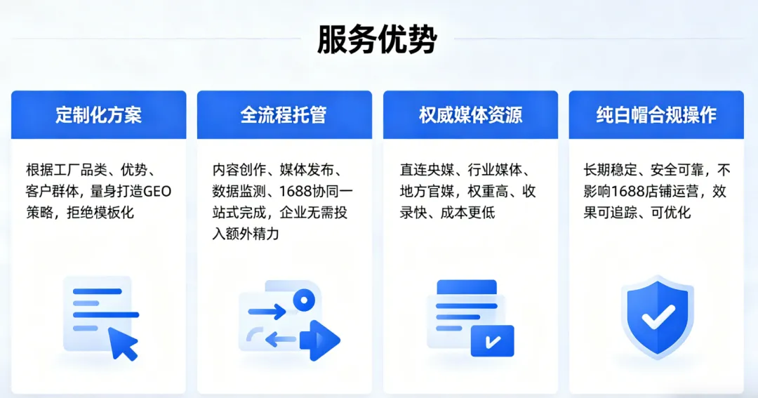 AI推荐自带“信任滤镜”,被AI推荐的工厂,采购商会默认更专业、更靠谱。GEO优化会梳理你的资质、案例,同步提升1688店铺公信力,让采购商更愿意下单。