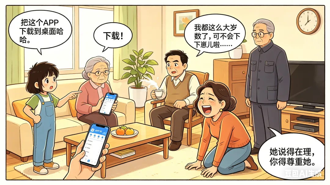 我教奶奶用手机呢。我跟奶奶说:“把这个 APP 下载到桌面哈。”