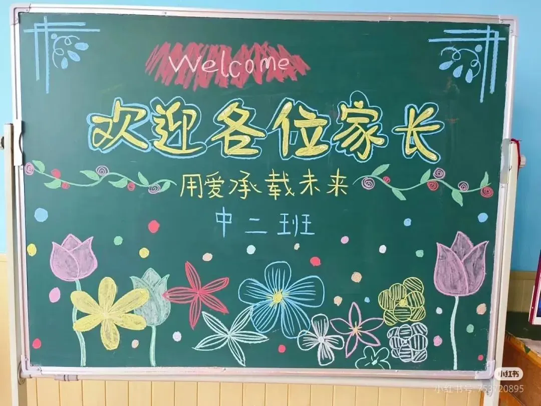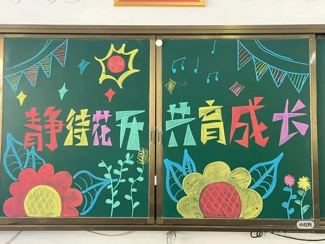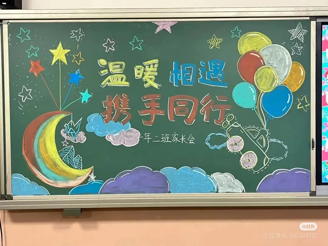 4. 装饰图案:使用花朵、星星、气球等元素进行点缀。花朵可以绘制在黑板底部边缘,如向日葵,寓意阳光与希望;星星散布在天空背景中,使整个黑板看起来更具梦幻感;气球可以系在一些图案旁边,写上如“欢迎”“沟通”“成长”等字样,增添活泼氛围。