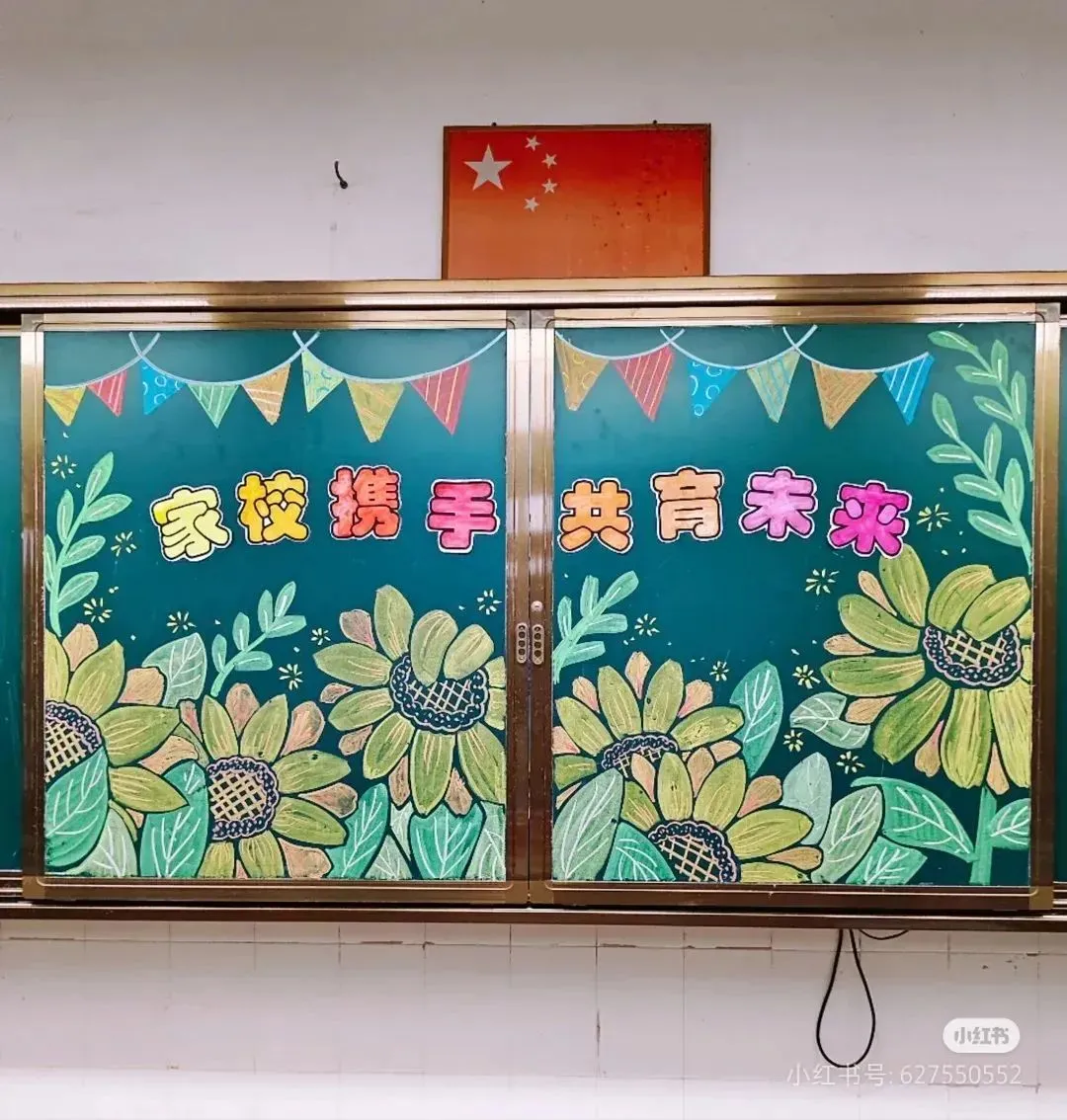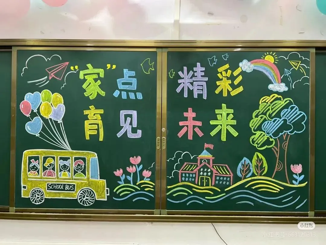 3. 人物形象:描绘不同表情和姿态的学生形象,有的在认真思考,有的在举手发言,有的在开心阅读,分布在黑板的各个角落,体现学生们丰富多彩的校园生活和积极向上的学习状态。再画几位老师的形象,拿着教鞭、教案,面带微笑,表现出教师的敬业与和蔼可亲。此外,添加一些家长的简笔形象,如在旁边观看孩子学习或者与老师交流的场景,强调家校互动。