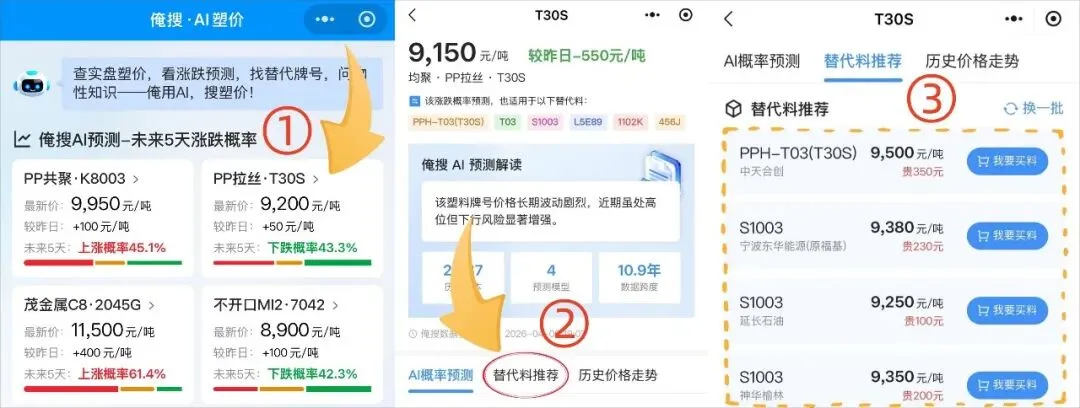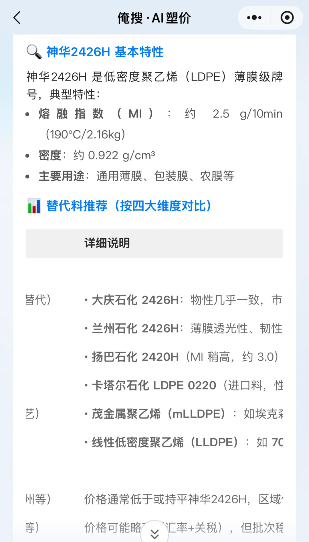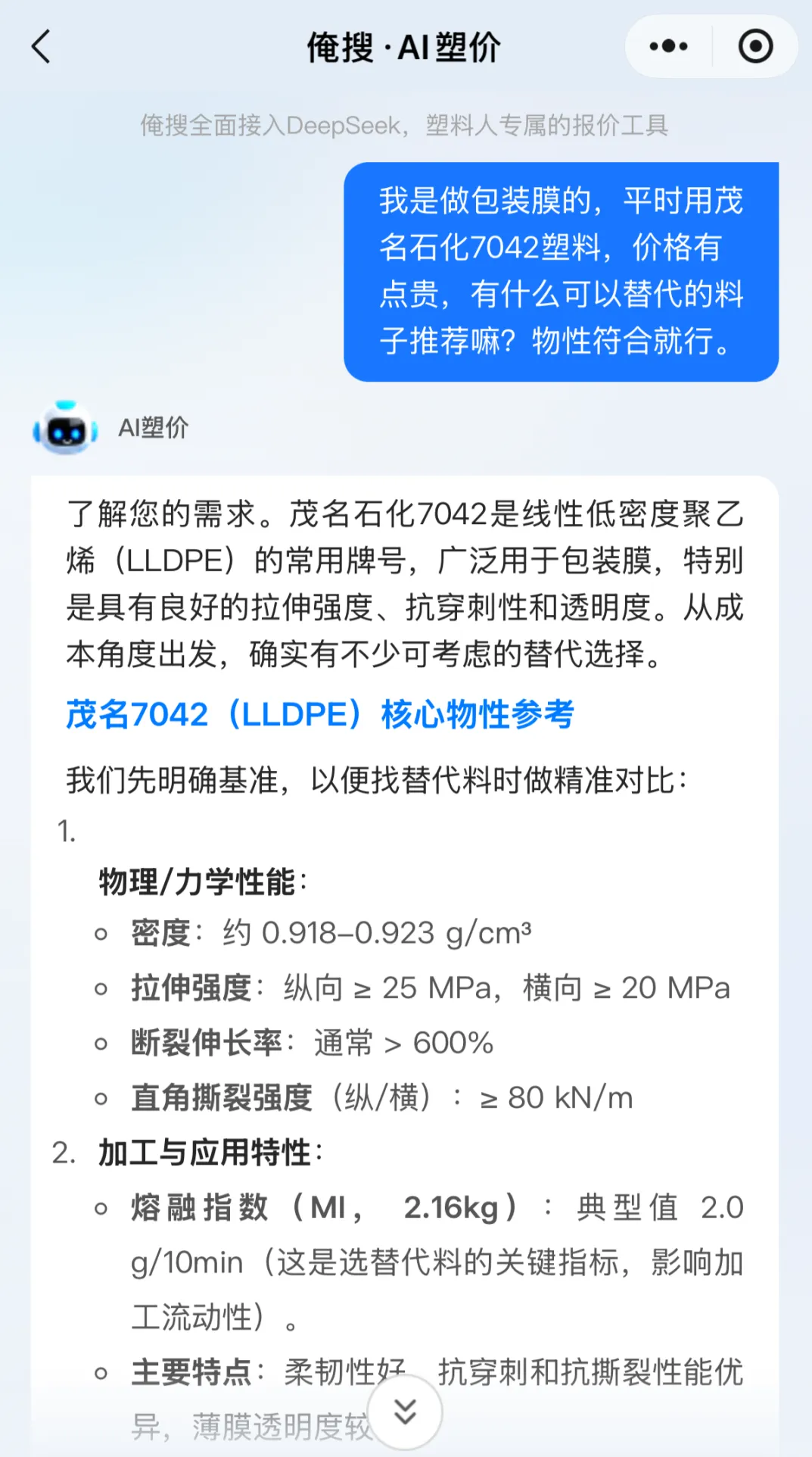直接问俺搜AI塑价xxx牌号有什么替代料。