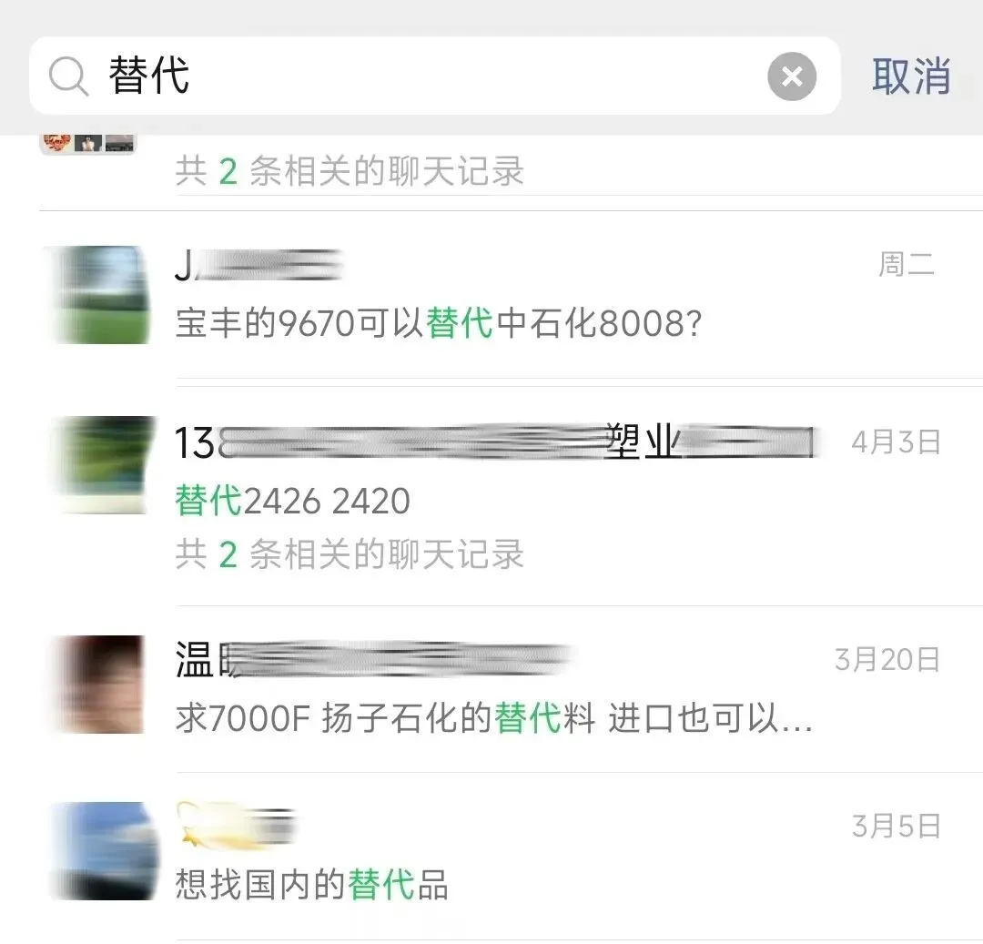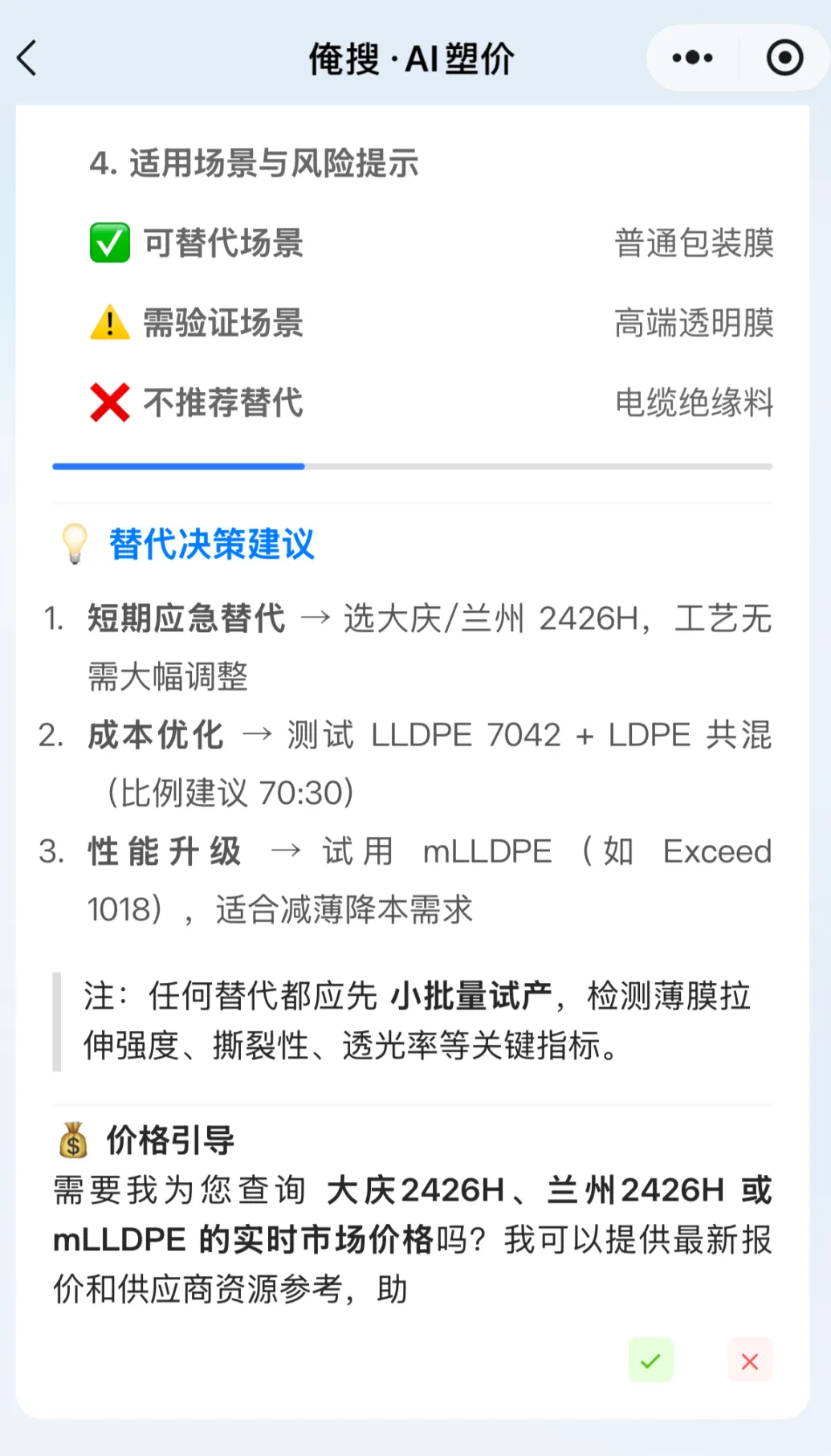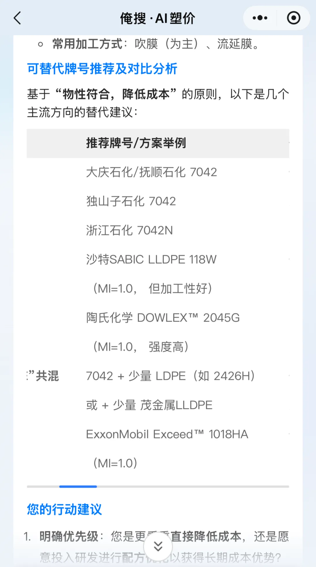 直接问俺搜AI塑价xxx牌号有什么替代料。