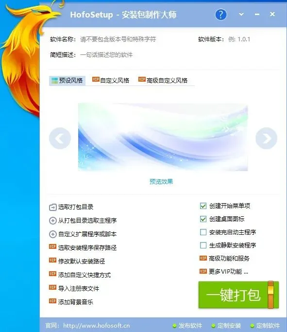 HofoSetup,中文名叫 安装包制作大师,是一款很酷的软件安装包制作工具。它支持一键制作安装程序、极速安装,还能加各种炫酷效果。你可以自定义风格或者用高级自定义功能,让生成的安装程序看起来很有专业范儿。安装速度也很快,不用等半天。