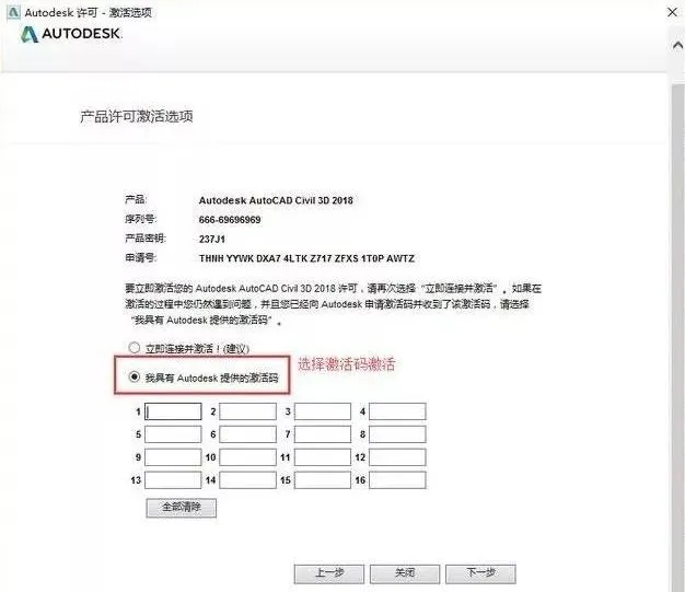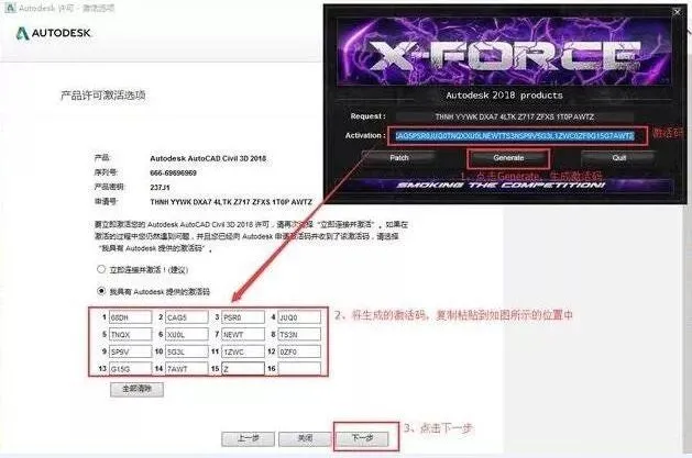 17.点击“Generate”生成激活码,将得到的激活码复制到图示框内,点击下一步。