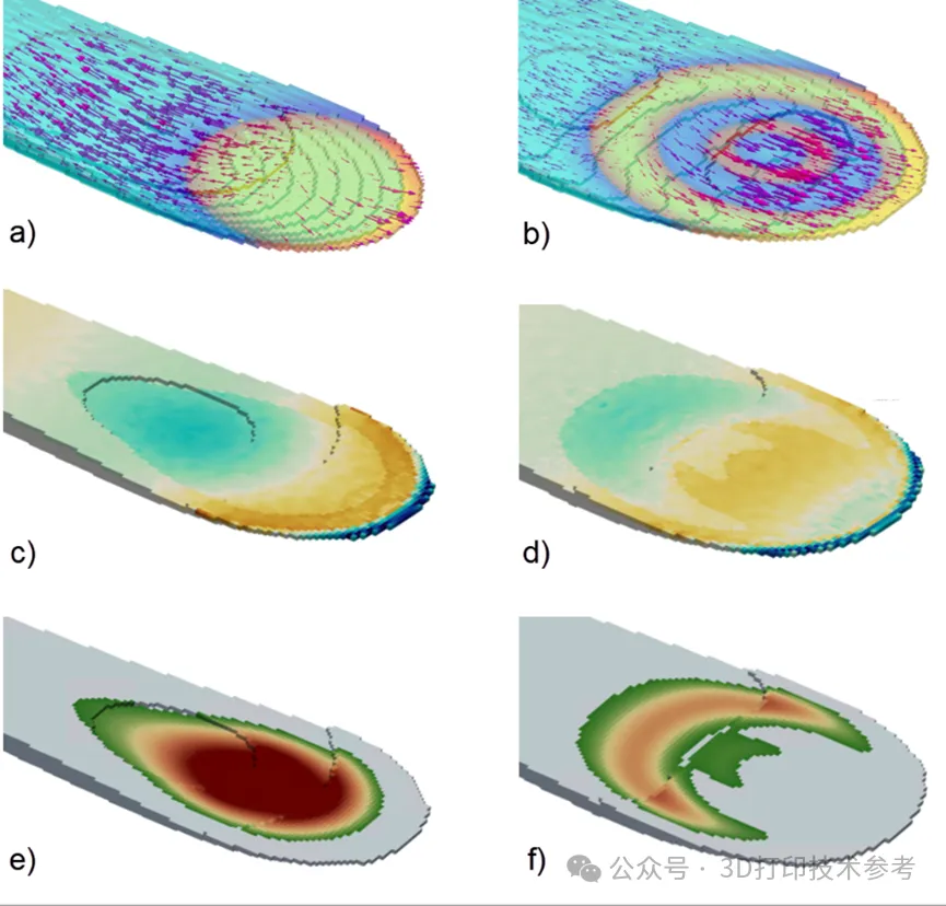 图 3:FLOW-3D AM 中的熔池模拟,比较高斯分布(左)和AFX环剖面(右),a),b) 速度矢量,c),d) 表面张力压力分布,e),f) 反冲压力分布