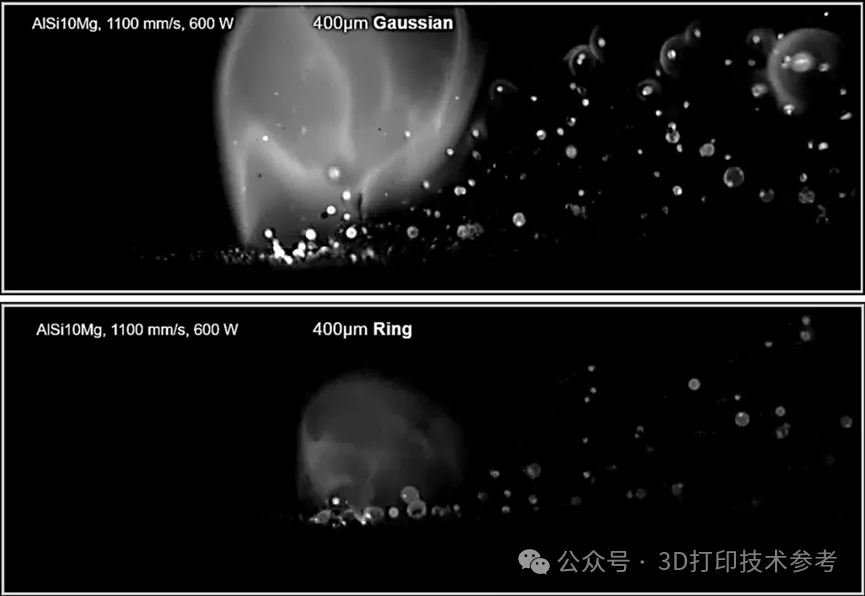 图 4:粉末床熔融过程中高速摄像的侧视图,与nLIGHT AFX激光器的环形强度分布(下)相比,标准单模激光器的高斯强度分布(上图)的烟灰、飞溅物和蒸发的冷凝物含量更高。两张图像都与相同的合金(AlSi10Mg)和激光参数(600W 在 400um 聚焦光斑尺寸中,以 1.1m/s 扫描)相关联
