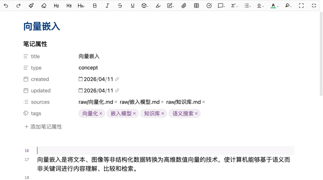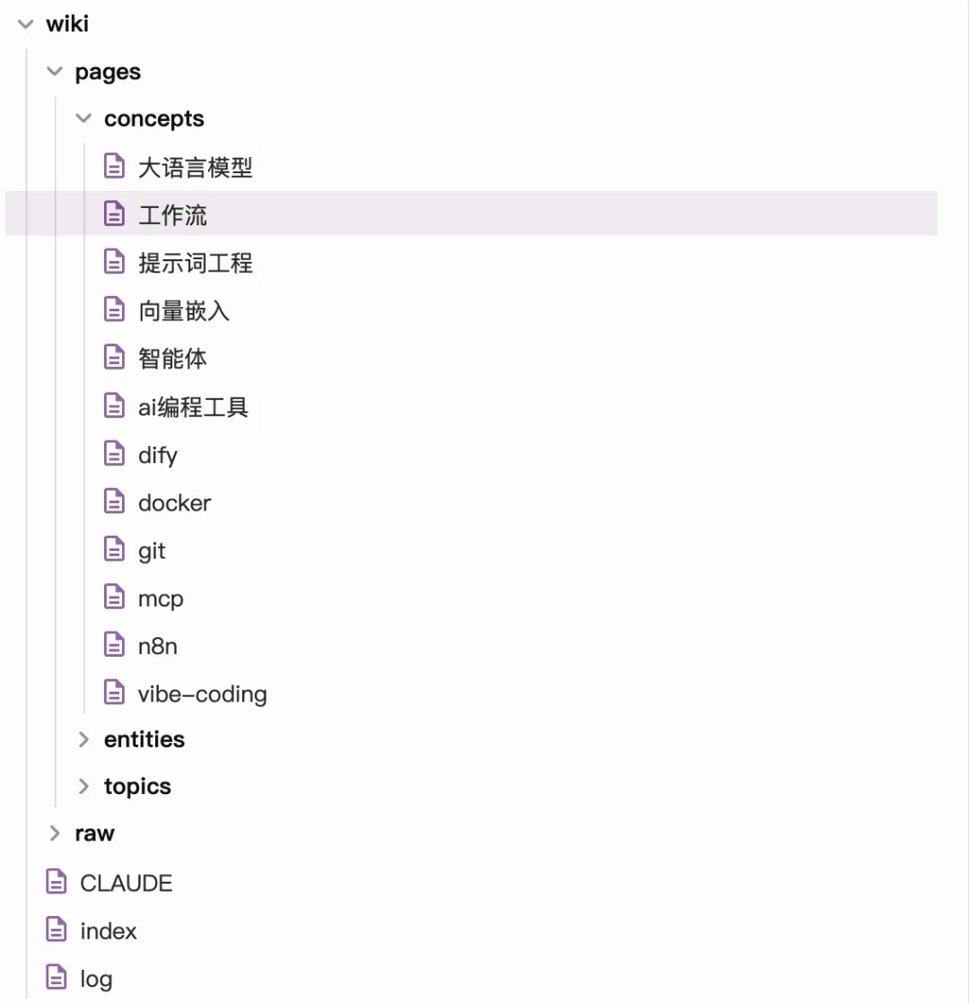 你会看到 wiki/pages/ 下出现了新的页面。点进去,有结构化的内容,有双链,有 frontmatter 元数据。