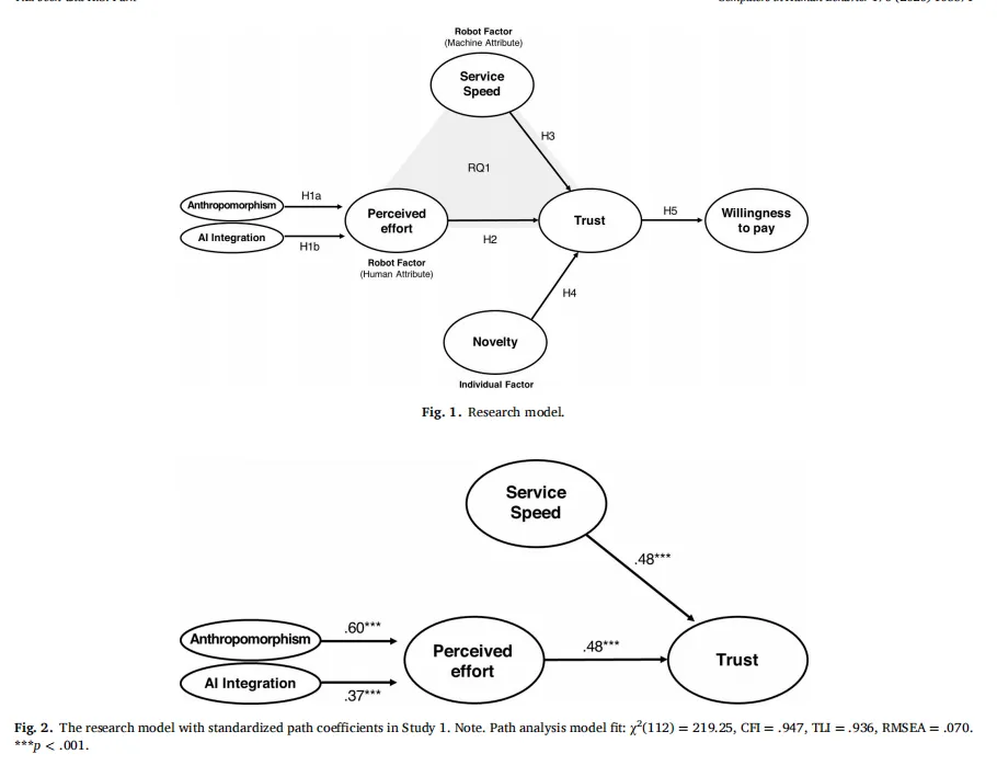 机器人服务中,“努力”(human-like)与“速度”(machine-like)并非对立,而是可以共同增强信任。研究发现:消费者通过拟人化和AI整合感知机器人的努力,进而提升信任,并愿意支付更多。