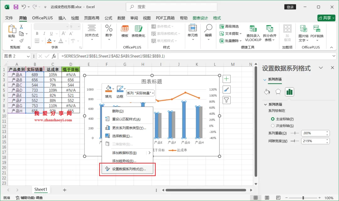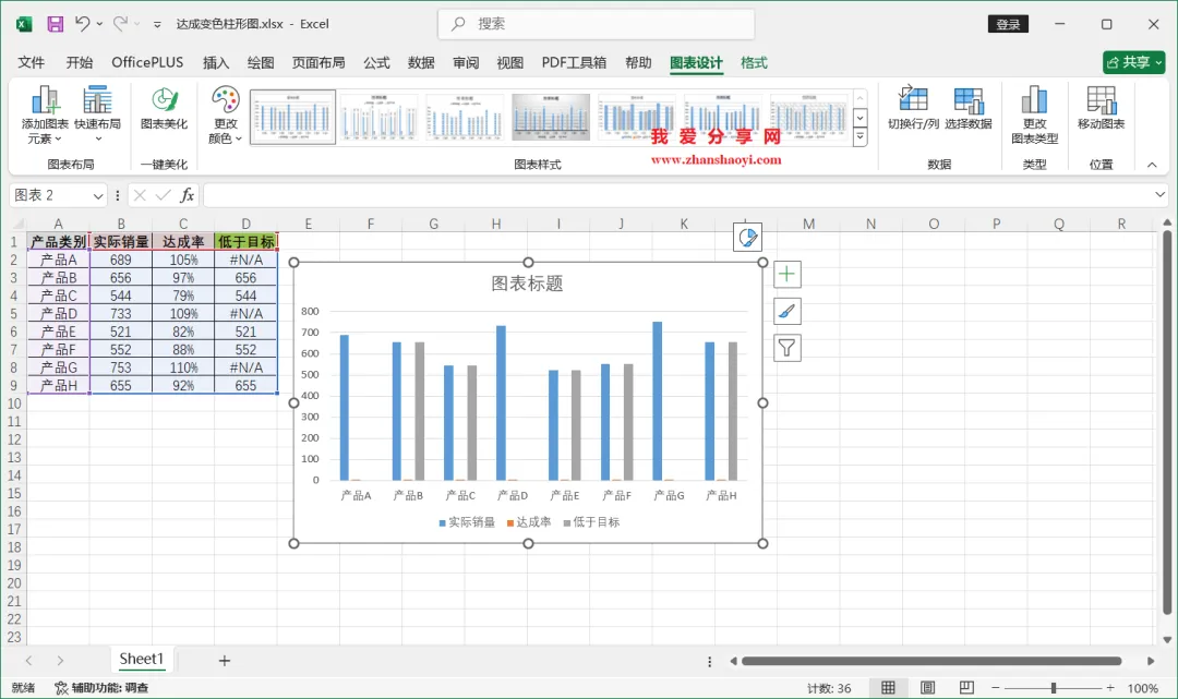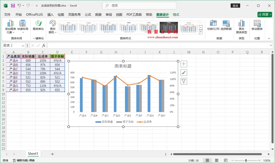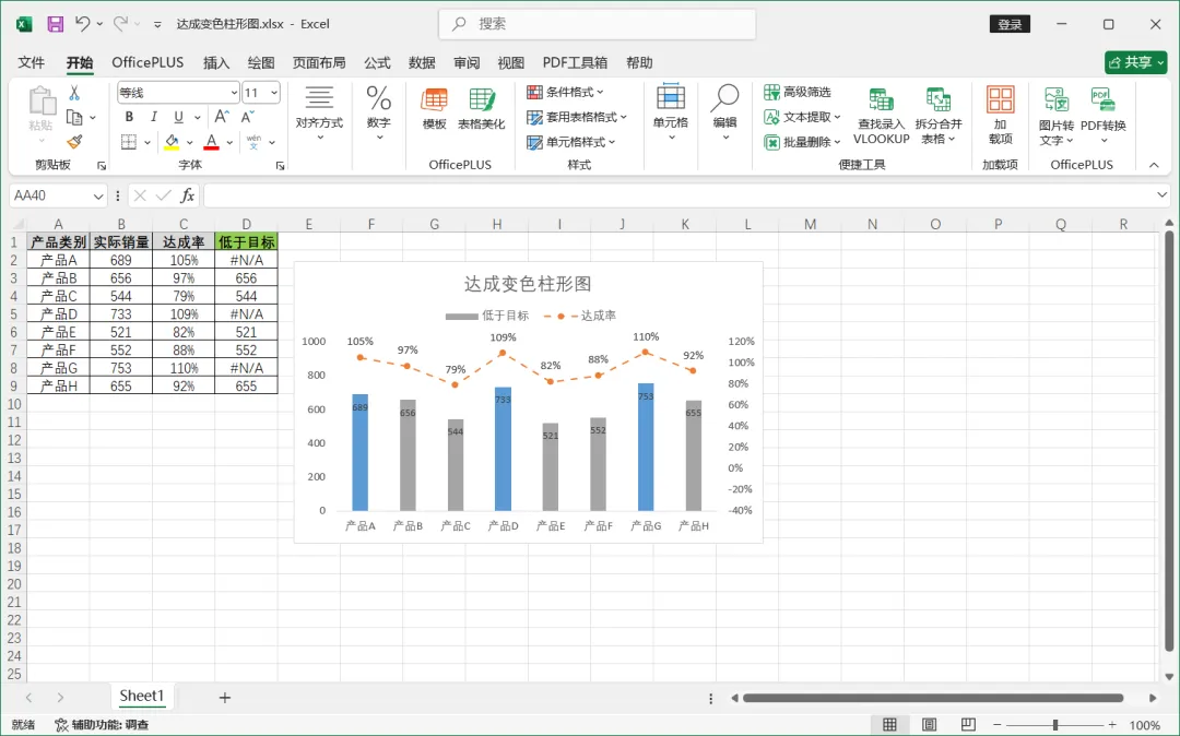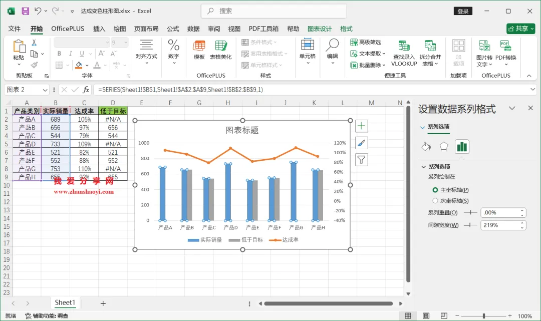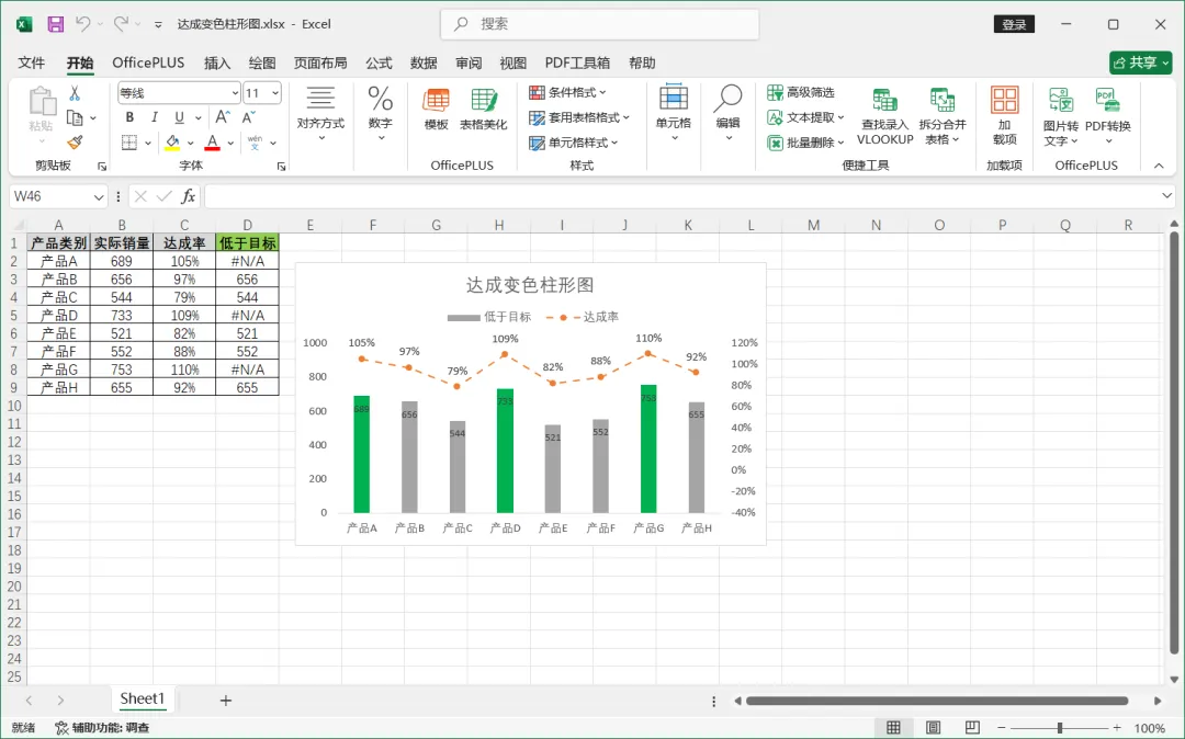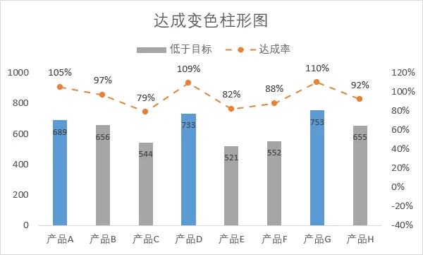 本期给大家分享在Excel中绘制达成分析图,图表可显示不同产品的销售及达成情况,通过柱形图颜色自动突出显示已达成的产品类别(或系列);