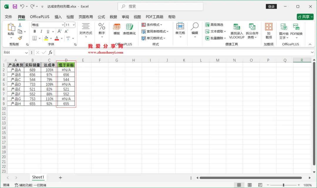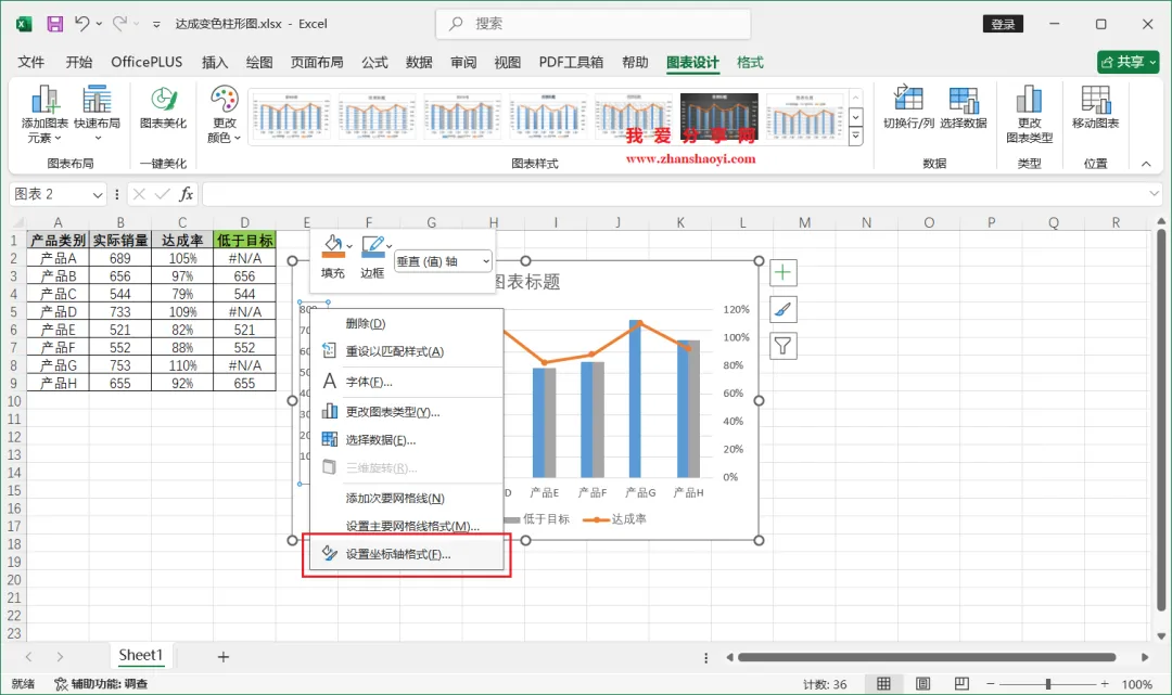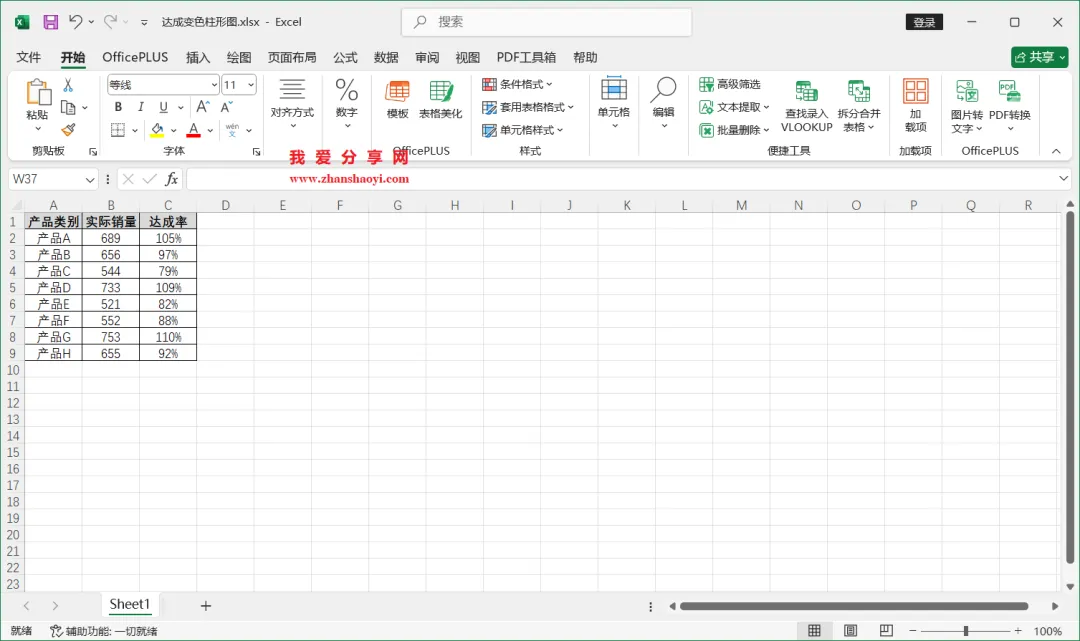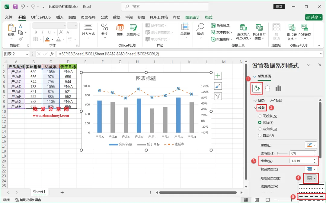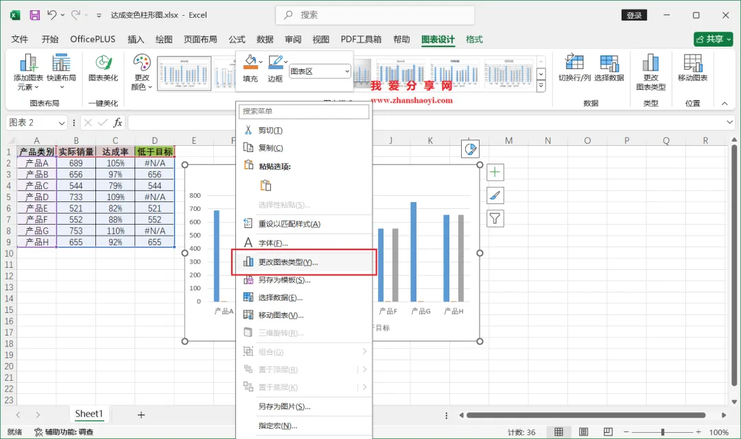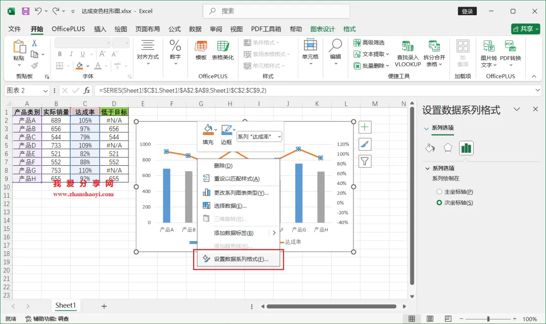 本期给大家分享在Excel中绘制达成分析图,图表可显示不同产品的销售及达成情况,通过柱形图颜色自动突出显示已达成的产品类别(或系列);