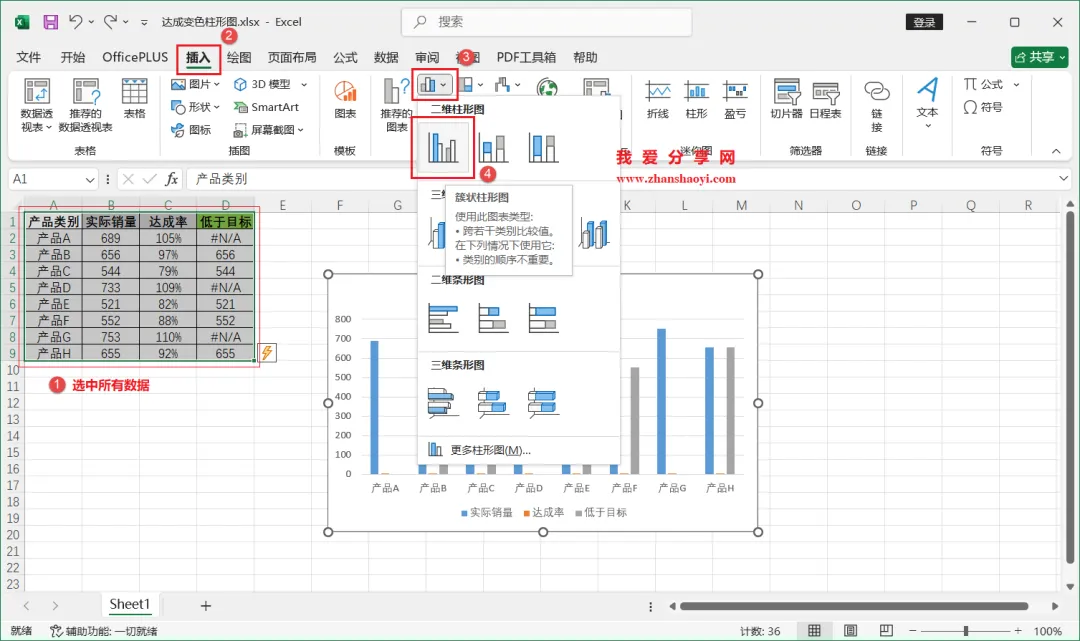 3、第二步,插入组合图,先选中所有数据,然后点击上方菜单栏中【插入】,再点击在「图表栏」中点击【柱形图】按钮,在展开列表中选择【簇状柱形图】;