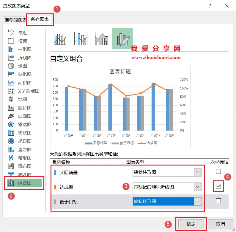 6、图表类型及主次坐标轴的设置如下图,达成率系列放置于次坐标轴,图表类型选择折线图,其余两个系列采用簇状柱形图;