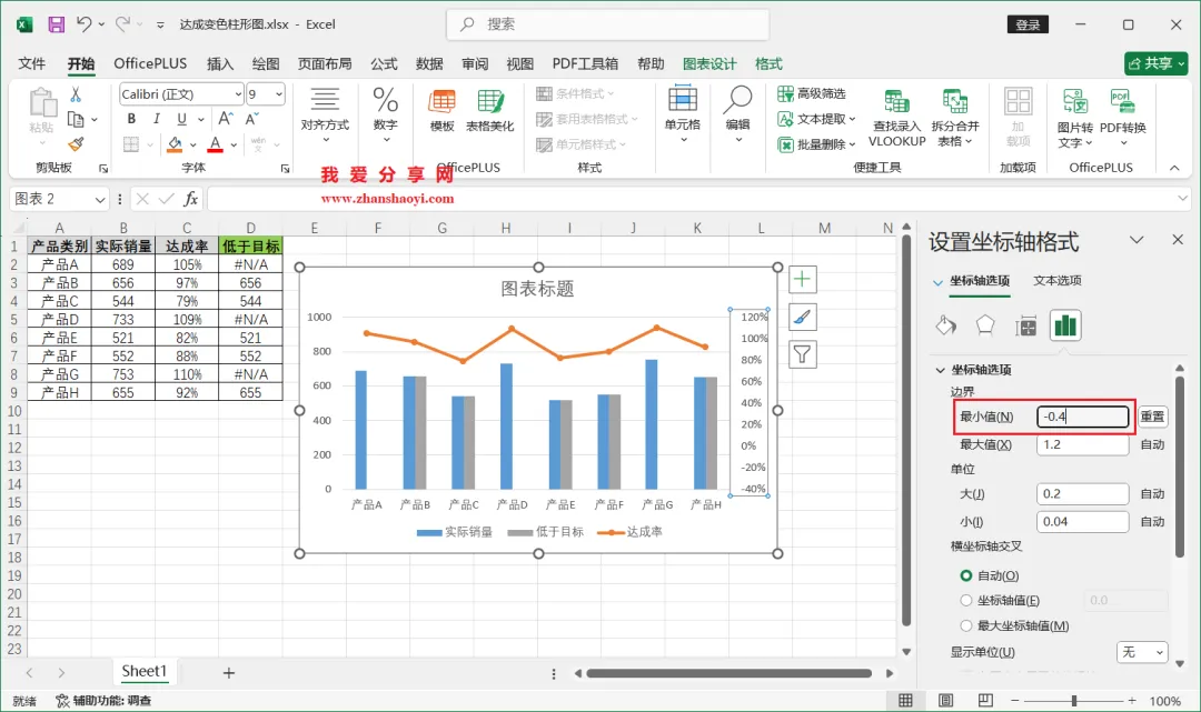 10、继续选中次坐标轴,将最小值调小设置为-0.4,使折线高度上升;