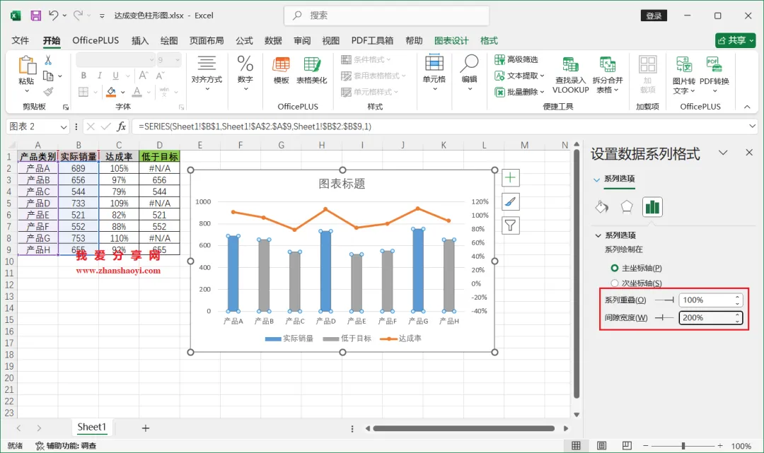 12、将系列重叠设置为100%,间隙宽度设置为200%;