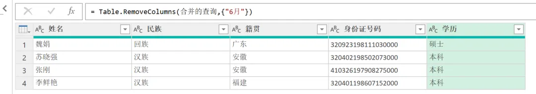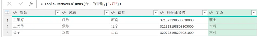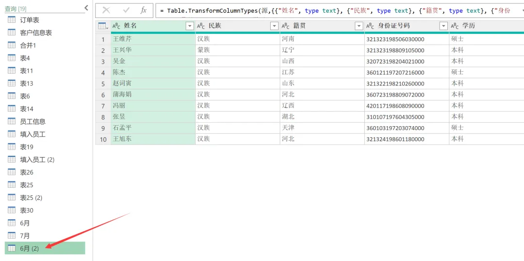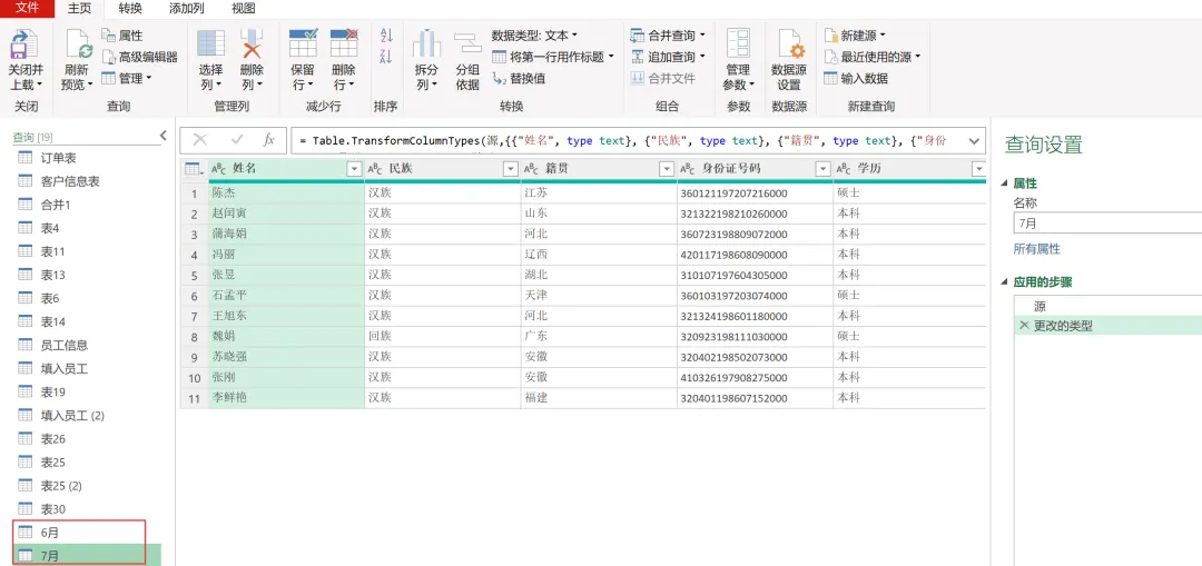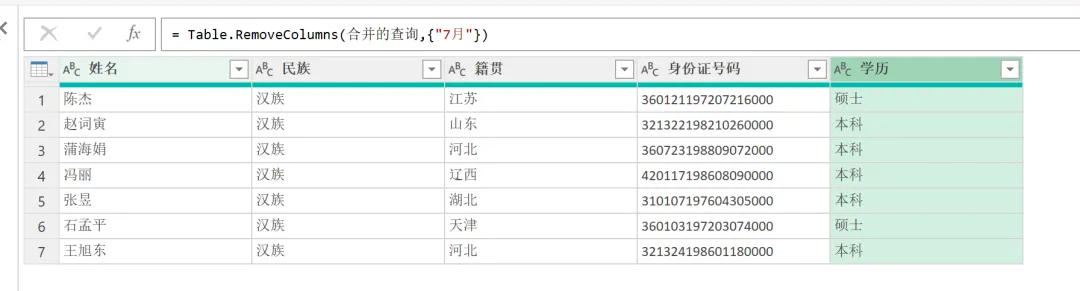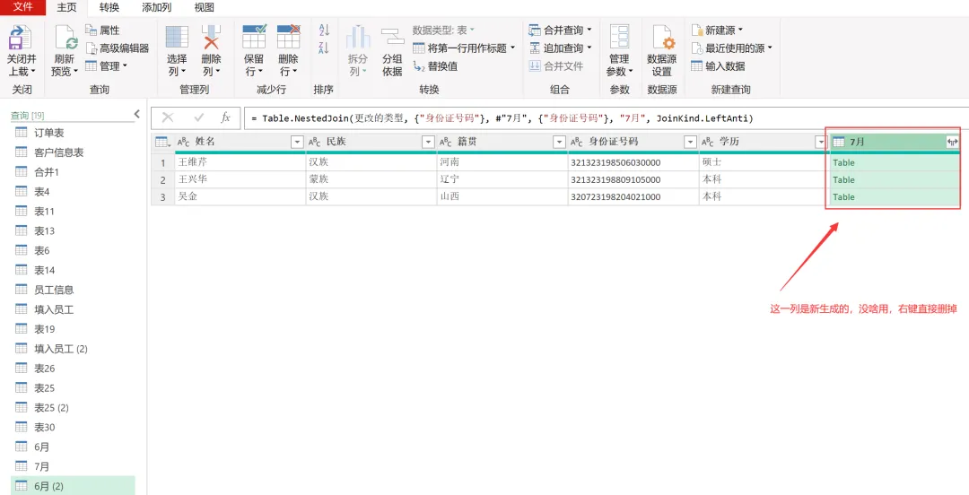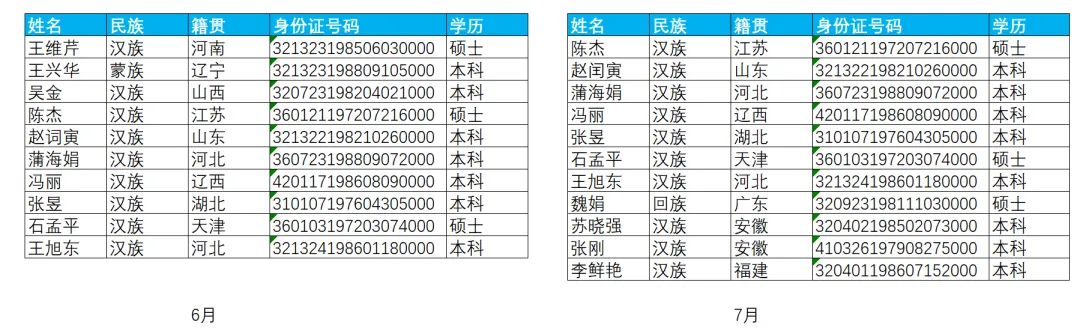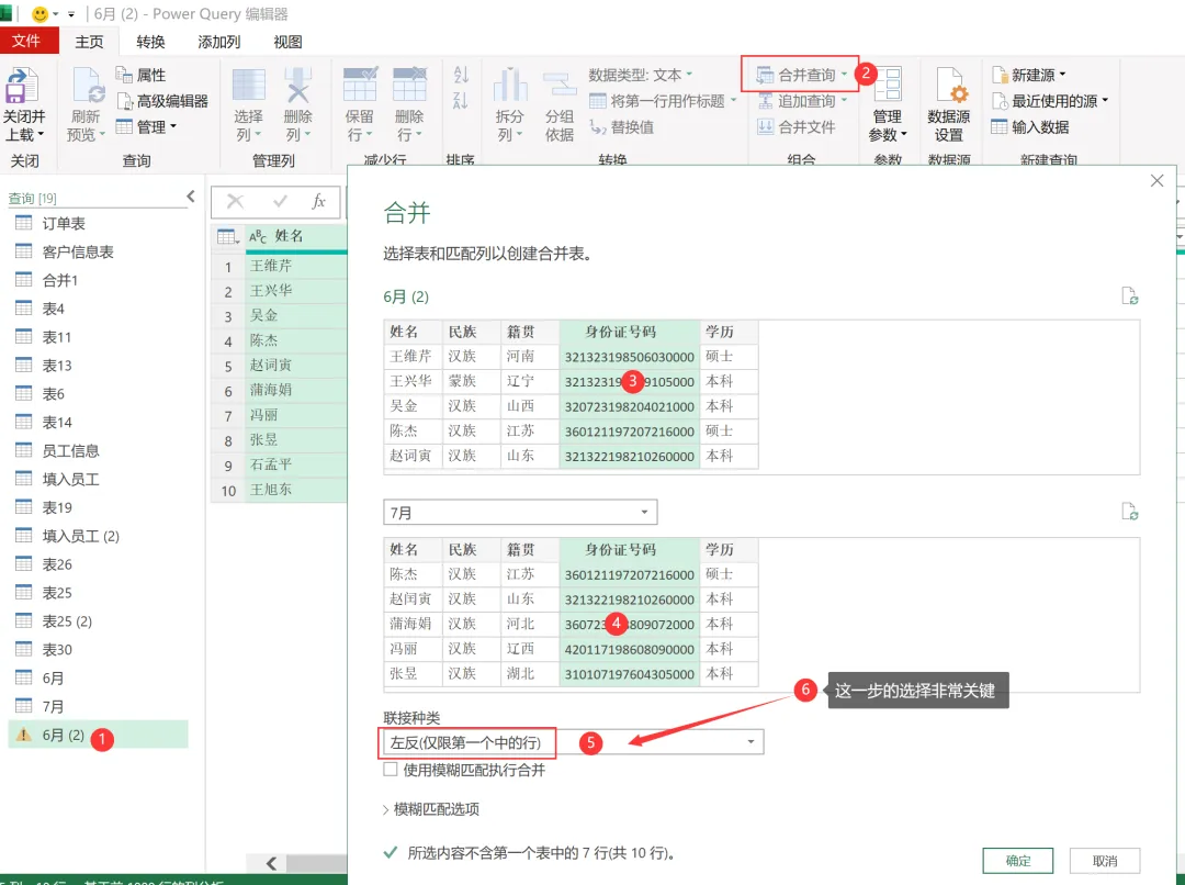 EXCEL|Power Query之对比数据今天讲的对比数据部分,咱们用6月和7月的花名册作为原始数据。这2部分的差异,主要体现在:6月有7月没有的部分,这部分代表的是6月在职7月离职的部分;6月没有7月有的,这部分代表的是6月没来7月新增的部分;还有就是6月和7月都有的部分,就是稳定员工部分。2)复制6月数据。做这一步,是因为这个对比操作不在6月中直接做,就不会破坏6月的原始数据,因为6月的原始数据,后面还会用。直接在6月数据上右键复制,然后粘贴就行。3)然后操作在6月的复制版本6月(2)中进行。如下图所示。这里用到的是功能区的合并查询,用到的匹配字段是身份证号码,因为别的字段可以重复,唯有身份证号码是唯一值。另外还有一点很关键,这里连接种类选的是左反。关于连接种类的几个选型,咱们等下再具体介绍。4)上一步操作后,会生成一个新列,那个列没啥用,可以直接删掉,操作如下。5)之后呈现结果如下。这样就获得了6月在职7月离职的人员名单。这次的操作是复制一份7月的花名册,然后在7月(2)里操作完成。用到的功能依然是合并查询,对比数据是6月的原始数据,查询依据依然是身份证号码,连接种类选择依然是左反,操作如下:1)再次复制6月的人员名单,命名为都在职,然后使用这个表格选择合并查询,对比表格是7月的原始数据,查询依据依然是身份证号码。唯一的区别是在连接选择这里。这里的连接种类要选择内部。操作如下。2)点击确定后,删掉新增的一个列名字段后获得最终的结果如下。几点说明:1. 3个查询结果出来后,都要进行关闭并上载的动作。2. 合并查询的应用领域非常广,最难把控的,就是连接种类里的【左外部】、【全部外部】、【内部】、【左反】这几个功能。接下来,咱们通过一张图表,来直观感受下几个选项的用法。放在一起对比,就很能区分出来。大概熟悉下,真正用到的时候,就差不多都能选对了。
